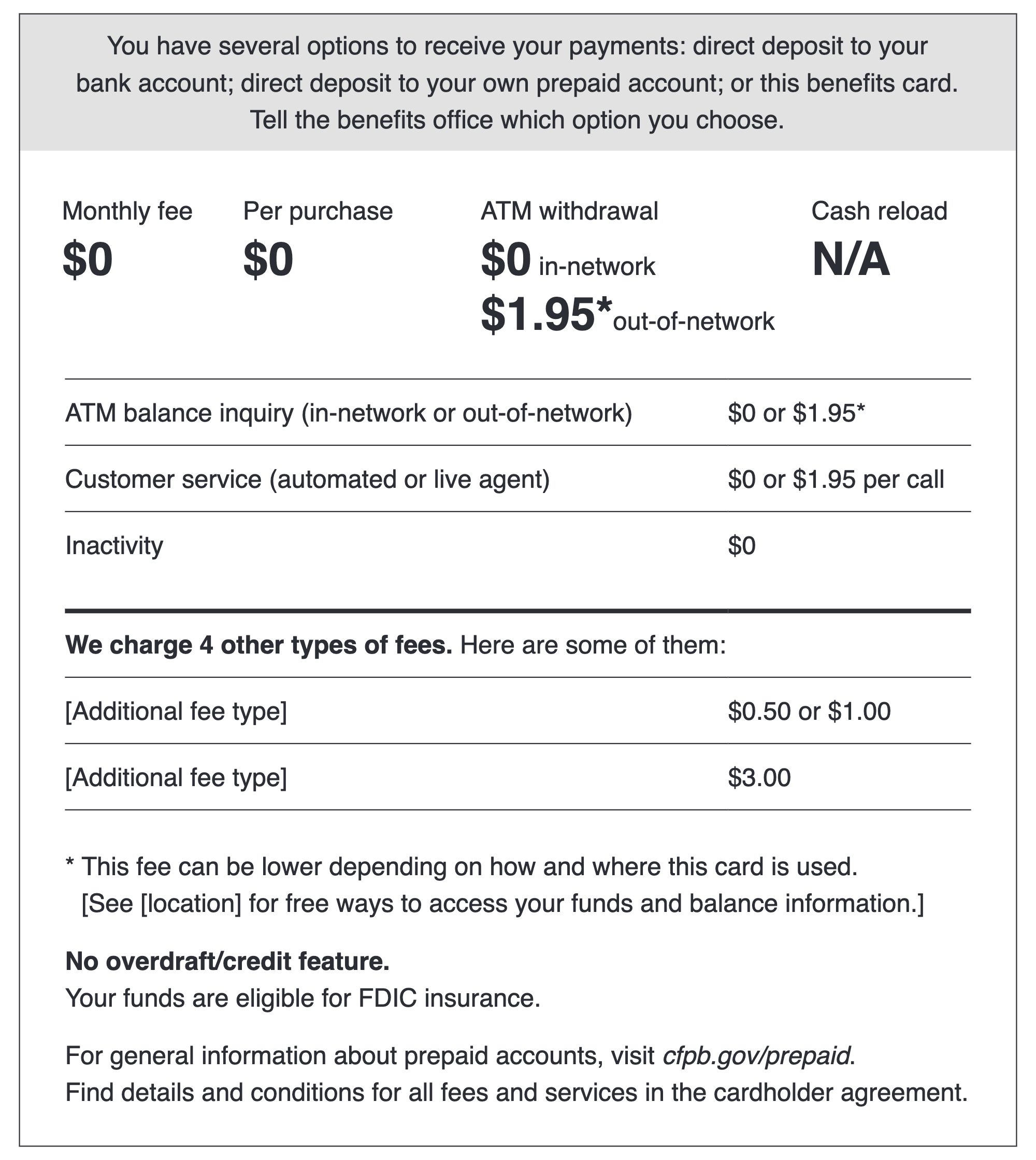 If you get your card in other settings, like online or over the phone, the card provider needs to give you this form on paper or electronically. This form will tell you where to find all fees and services (usually in the cardholder agreement).
